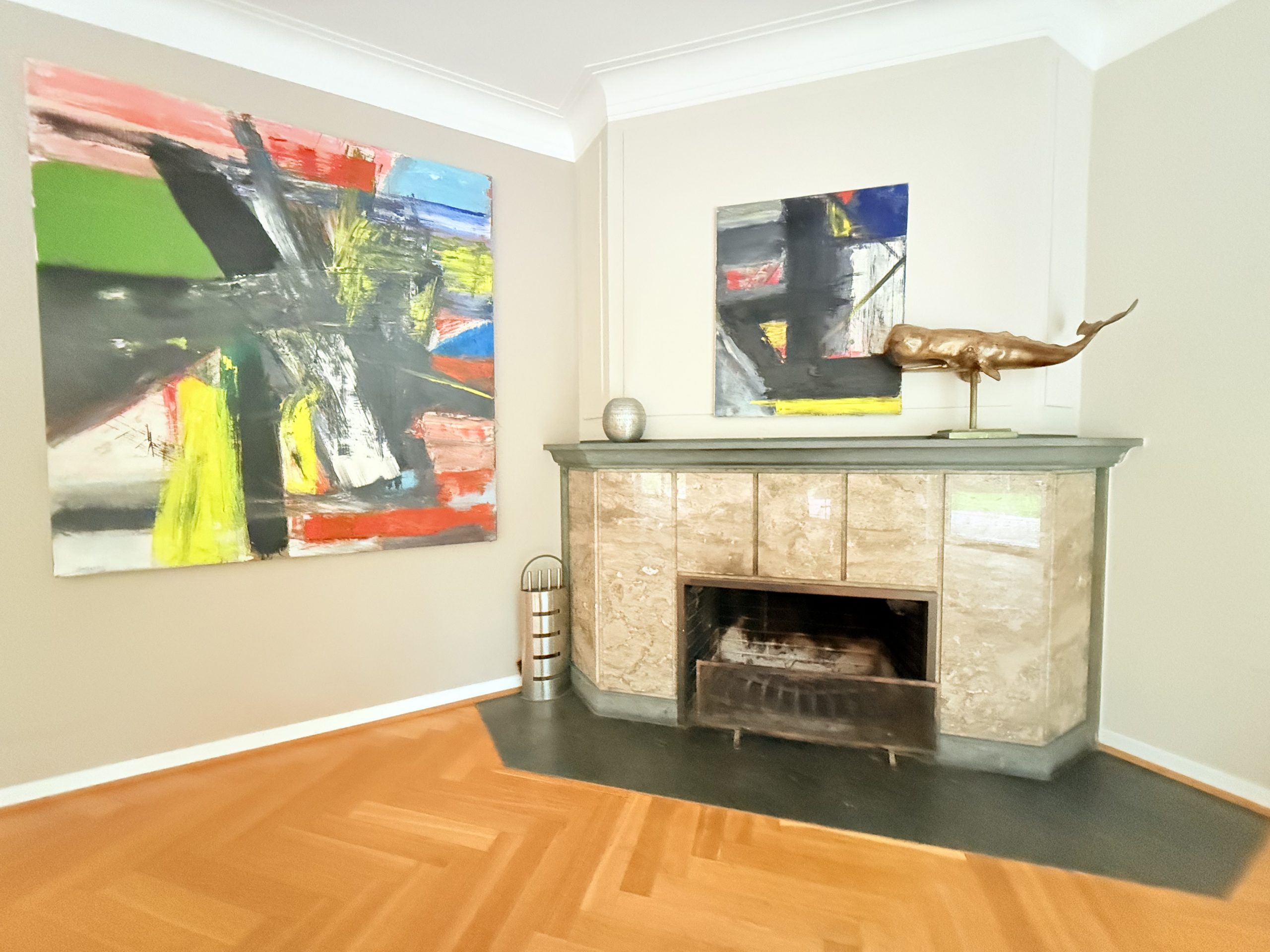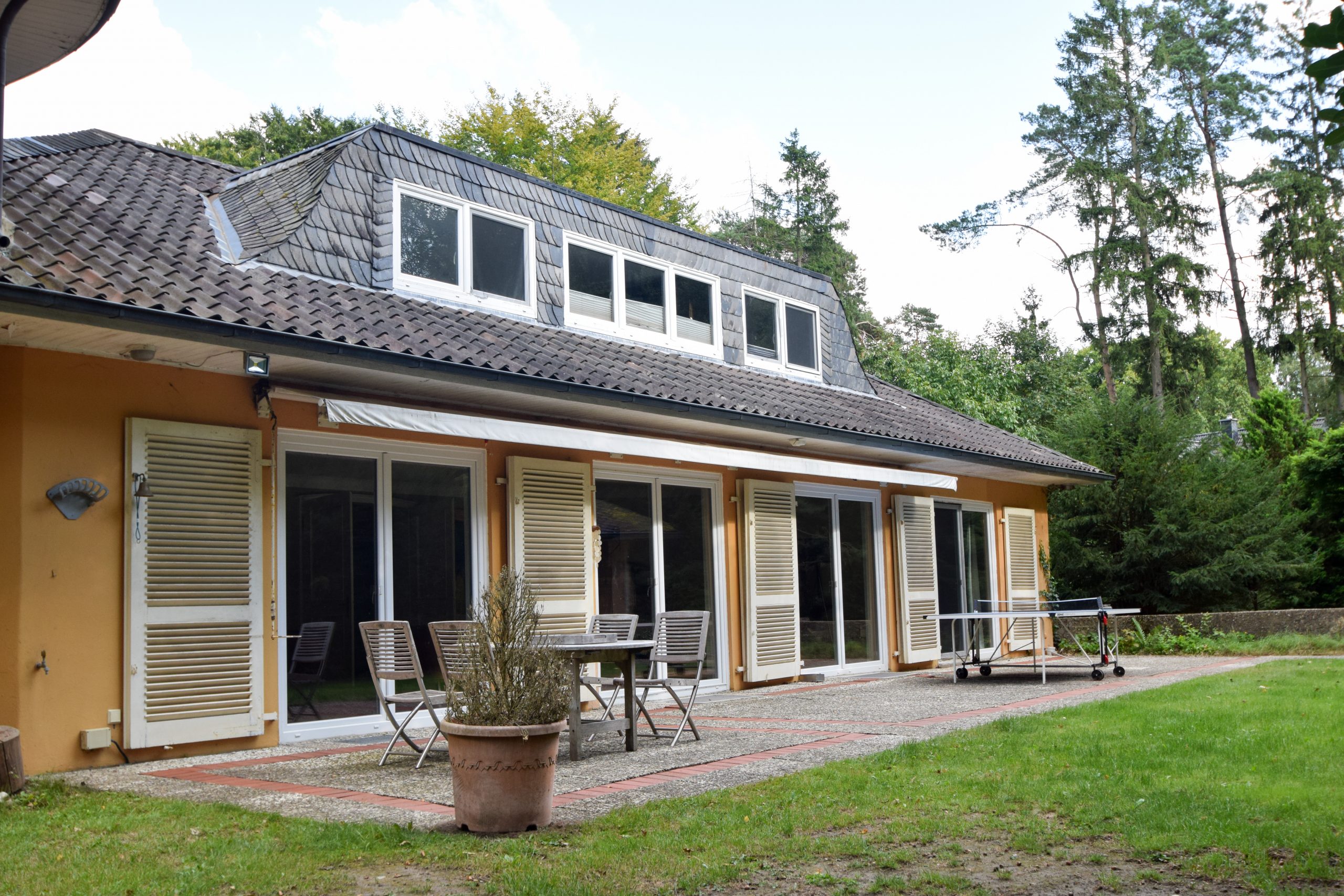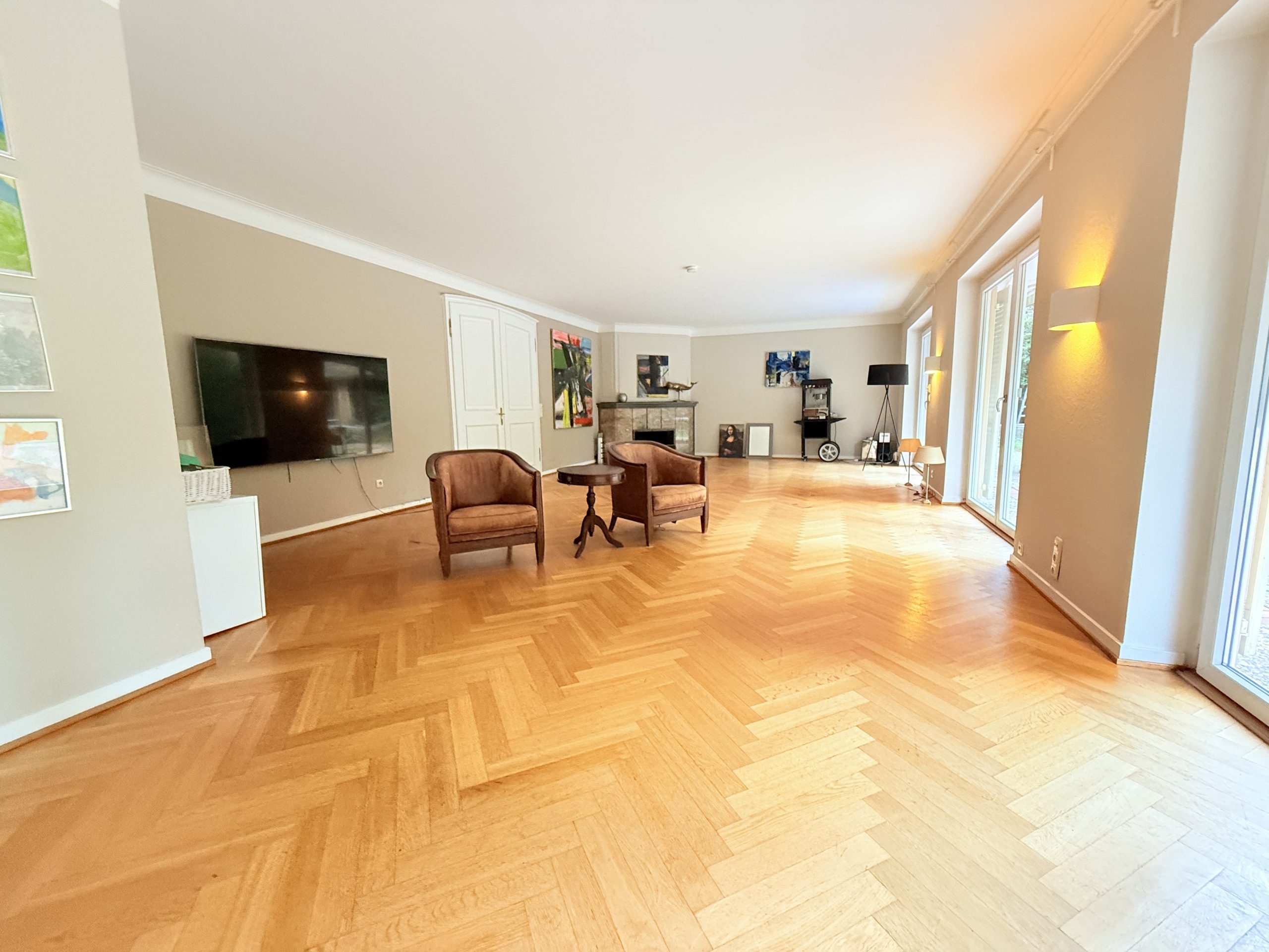 Das großzügige und helle Wohnzimmer im Erdgeschoss ist gut zu möblieren und mit einem hochwertigen Fischgrätenparkett ausgestattet. Im Wohnzimmer befindet sich ein offener Kamin, der zu gemütlichen Abenden einlädt. Über die Terassentür gelangen Sie direkt auf die Terrasse mit einem schönen Blick in den Garten. Gegenüber der Terrasse befindet sich ein überdachter Pavilion, der eine tolle Sitzmöglichkeit bietet.
