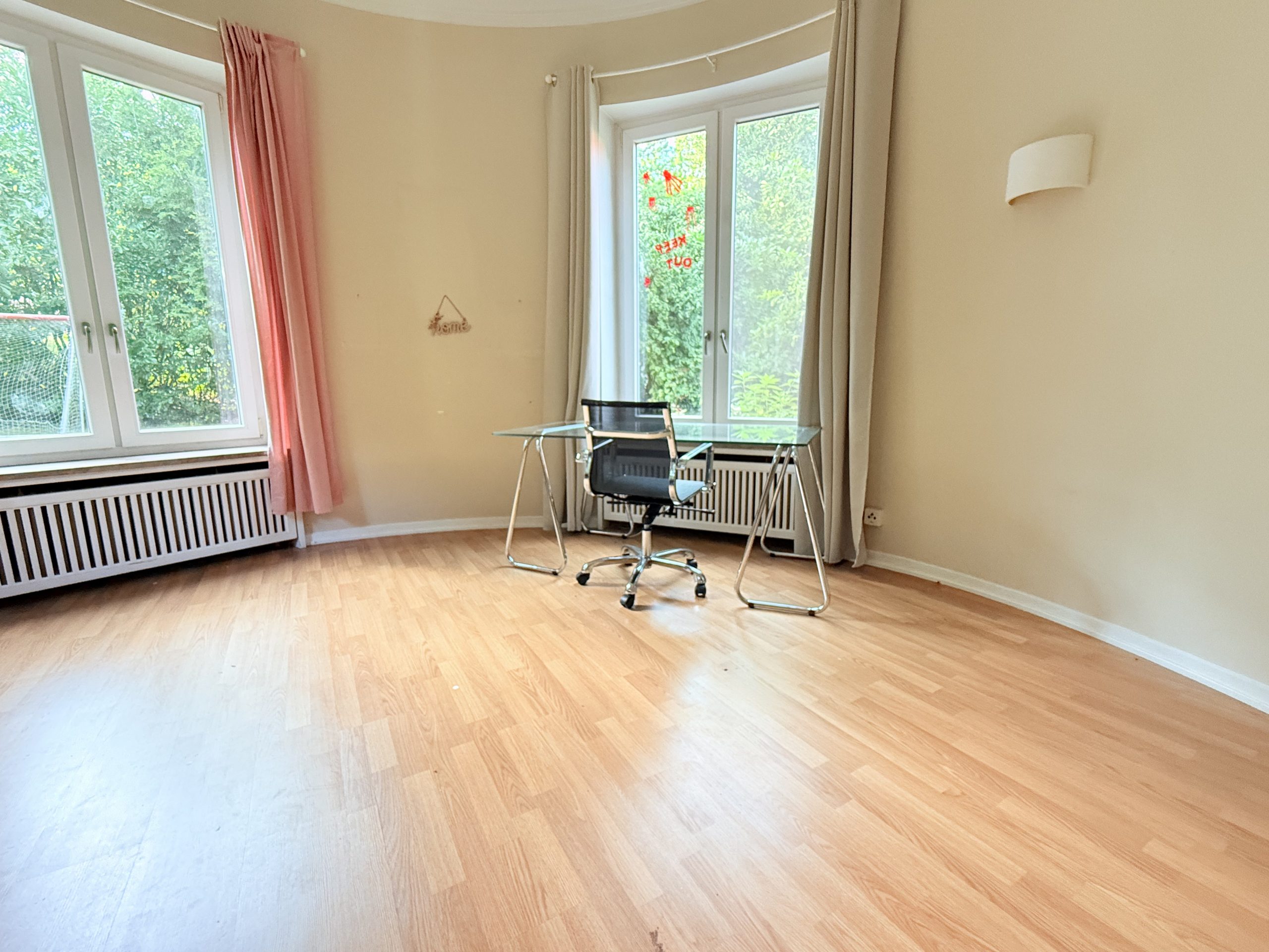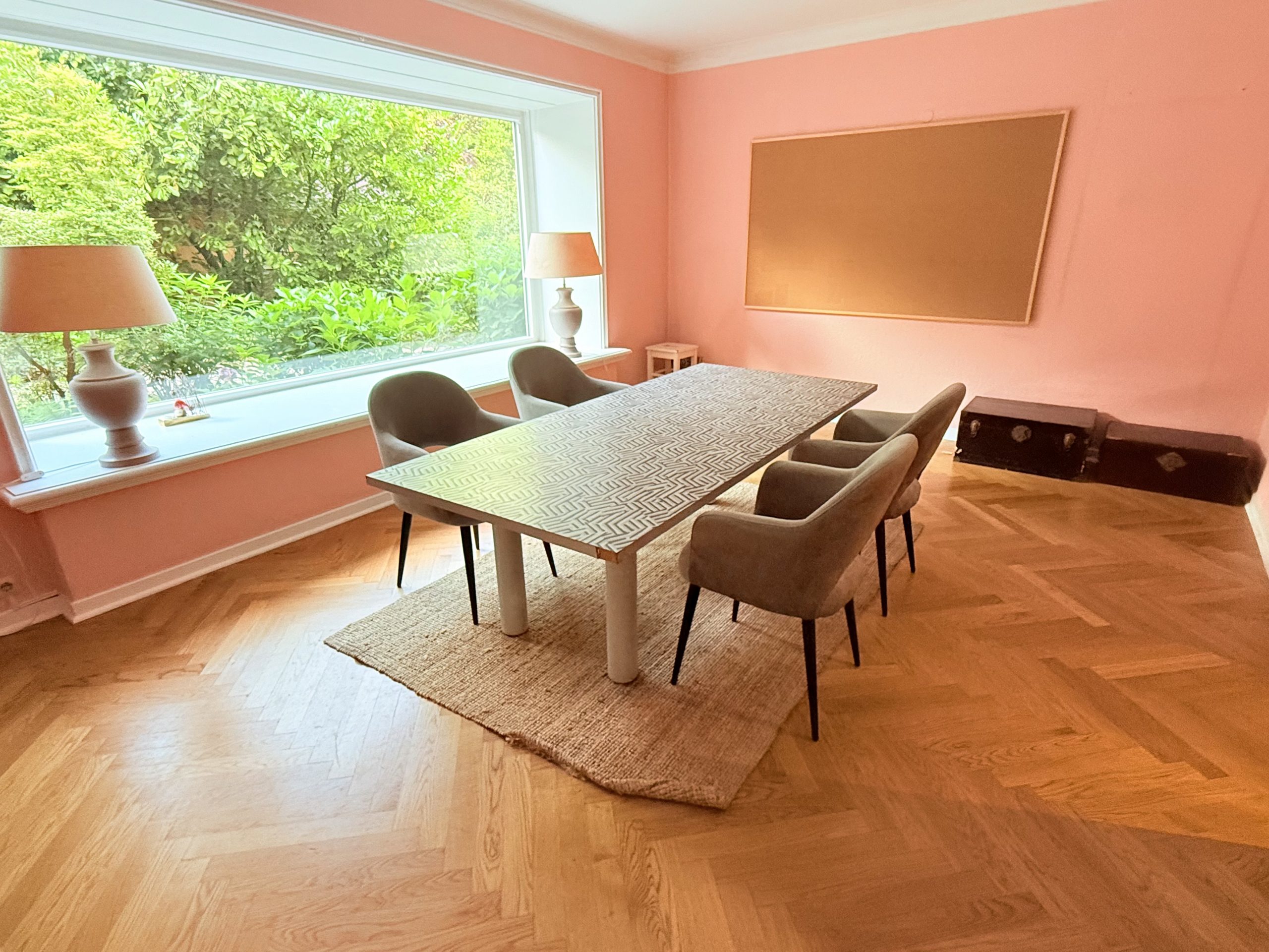 Über das Wohnzimmer gelangen Sie ebenfalls in den Turmanbau und das Esszimmer, welches mit einer schönen Fensterfront ausgestattet ist. Das Esszimmer verfügt ebenso über hochwertiges Fischgrätenparkett.
