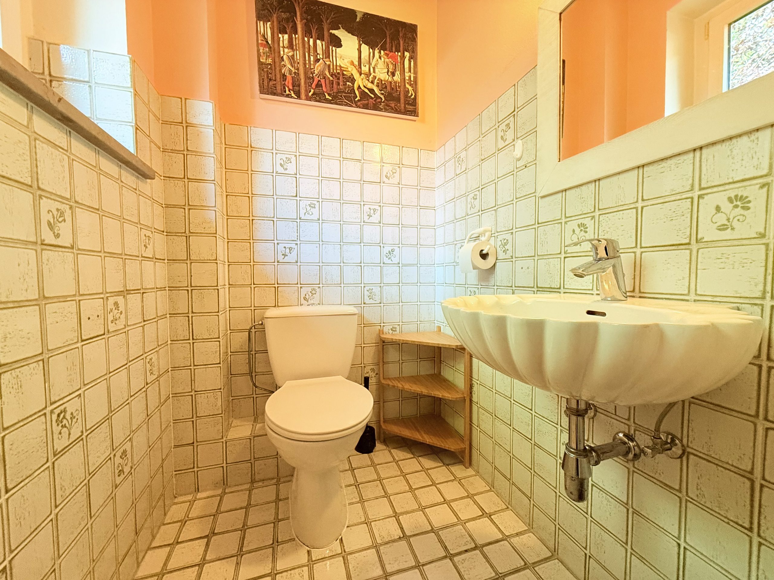 Im Erdgeschoss kommen Sie direkt in eine große und repräsentative Diele mit Fliesenboden. Von der Diele aus gelangt man in das Gäste WC. Über den daneben liegenden Flur gelangen Sie zum Schlafzimmer, Vollbad und zur Treppe zum Dachgeschoss. Das Erdgeschoss zeichnet sich durch eine großzügige Deckenhöhe aus.